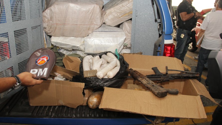 Foram apreendidos um fuzil HK de origem húngara com 219 munições, um fuzil 556 com 1075 munições, 16 quilos de explosivos plásticos, 52 espoletas, 500 quilos de maconha, 5 quilos de crack, cinco quilos de cocaína, cinco toucas do tipo brucutu, um blusão do exército, um caderno contendo informações, uma balança de precisão e medicamentos antibióticos.